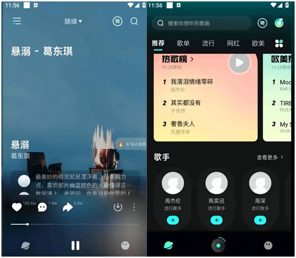 3千万曲库,流行、网红、古风、动漫、怀旧金曲、摇滚、电音、说唱、民谣、日语、欧美、韩语,所有歌曲应有尽有;陈奕迅、林俊杰等大咖全部网罗;