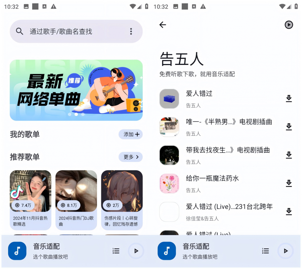 一款免费无广告全网音乐下载工具,你可以根据某句歌词来轻松搜索到你想要听的歌,可以选择在线试听或者一键下载。简约免费无广告,听音乐下音乐必备神器!